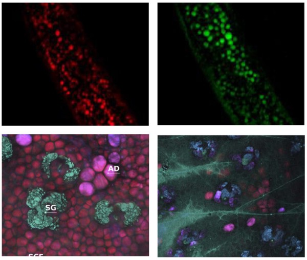 | NOCTUA顯微鏡系統(tǒng)允許在生理相關(guān)條件下對結(jié)構(gòu)和事件進(jìn)行成像,這是熒光標(biāo)記無法達(dá)到的。SRS圖像顯示了秀麗隱桿線蟲中的不飽和脂肪酸和膽固醇(上圖)。下圖顯示了小鼠耳朵皮膚中由脂質(zhì)形成的真皮結(jié)構(gòu)(左)和局部應(yīng)用的未標(biāo)記藥物穿透皮膚(右)。 | ![]() |
